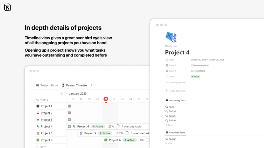 - Detailed view of all individual projects with deep dive of all outstanding and completed tasks.