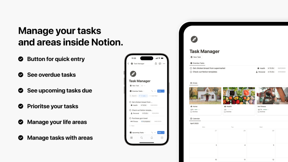 Say goodbye to missed deadlines and forgotten tasks and hello to a more productive and organized you. Our Task Manager Notion Template will help you stay on top of your workload so you can focus on what really matters - achieving your goals.